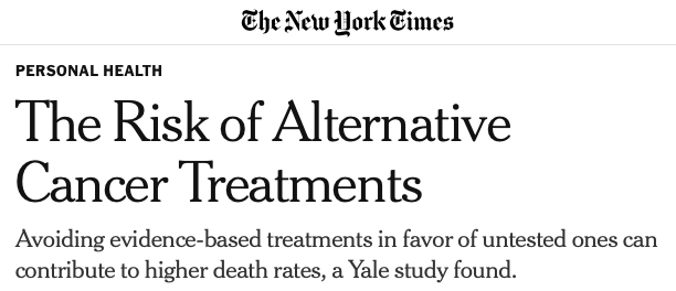 事实上,很多号称“纯天然的可以治愈癌症”的替代疗法是无效的,它们的背后是一整套的产业链,利用无助的病人的惶恐和焦虑来牟利。