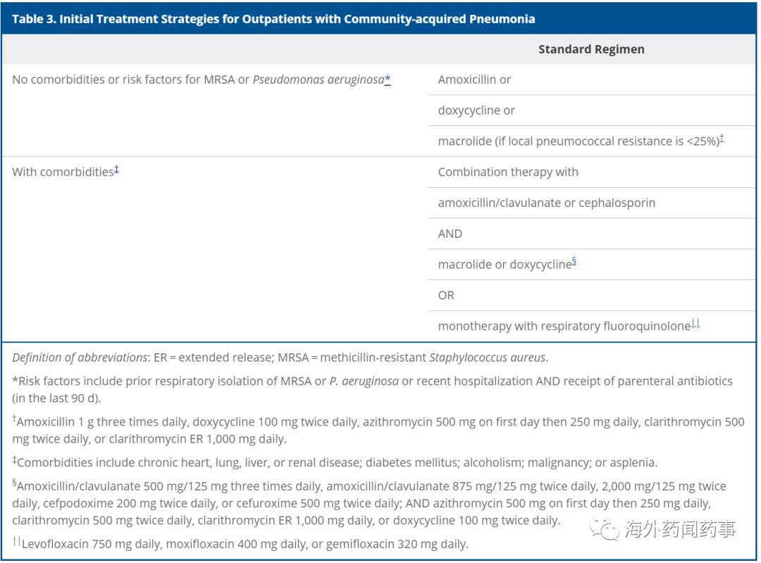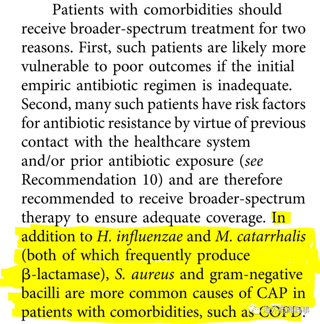 对于门诊高危CAP(例如有合并症的),指南建议阿莫西林-克拉维酸(或头孢泊酮或头孢呋辛)加大环内酯或氟喹诺酮单药治疗。指南指出除流感嗜血杆菌(H.influenzae)和卡他莫拉菌(M. catarrhalis)外,金黄色葡萄球菌(S. aureus) 和革兰氏阴性杆菌(gram-negative bacilli) 也是合并症患者中常见的病原体。