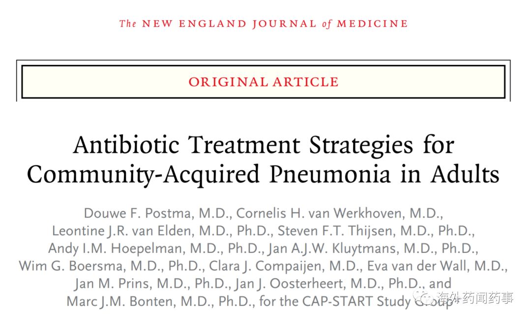 《新英格兰医学杂志》在2015年4月发表了一项在荷兰CAP抗生素药物干预的前瞻性、多中心、随机分组交叉试验(CAP-START),社区获得性肺炎住院(非ICU)患者接受以下一种治疗方案: