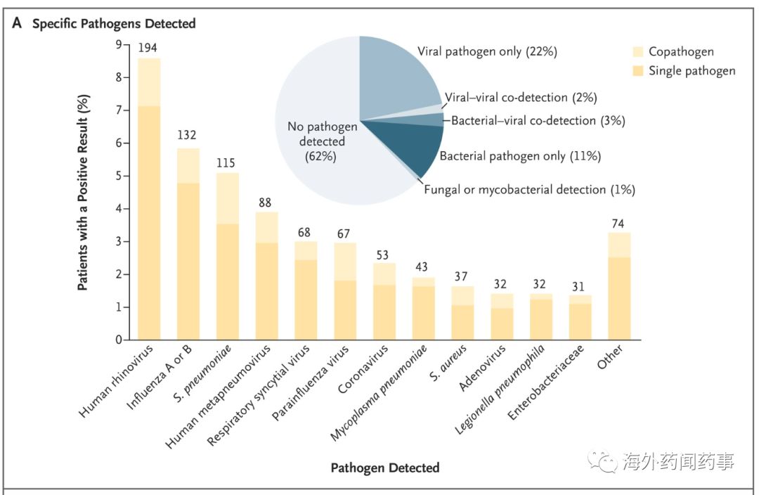 指南提到抗菌方案覆盖了最有可能引起CAP的病原体。但却没有引用2015年在新英格兰医学杂志Jain et al发表的研究数据,也没有对除了流感以外的病毒感染做进一步的说明。病毒是导致CAP的最常见的病原体。在2259例经放射学影像检查证实有肺炎及经过细菌和病毒的标本检测的住院患者中: