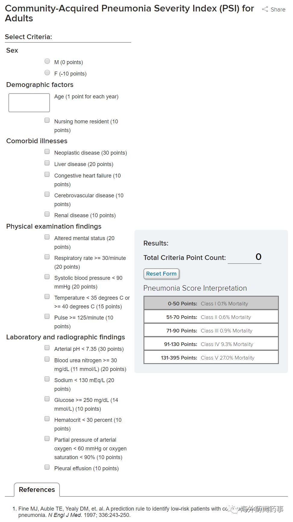 PSI评分系统来评估CAP患者门诊或者住院治疗: