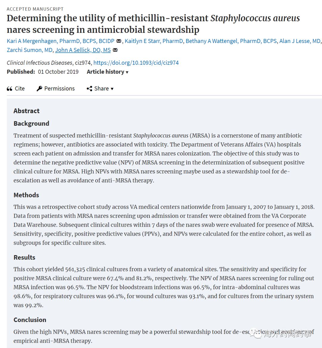 在CAP指南发表的同一天,一项回顾性研究指出MRSA nasal PCR筛查排除MRSA感染的阴性预测值为96.5%。血流感染的阴性预测值为96.5%,腹腔内培养为98.6%,呼吸道培养为96.1%,伤口培养为93.1%.